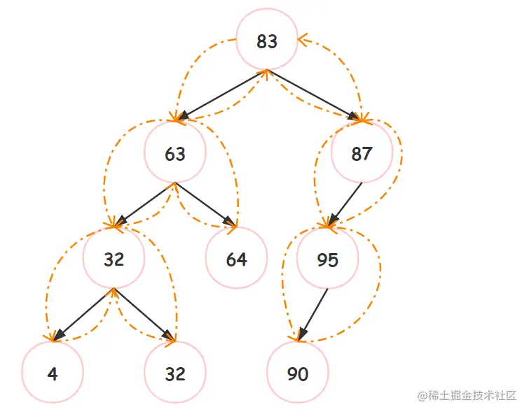 - 对于一个存在左子树的节点来说,中序遍历的前一个节点就是它左子树的最