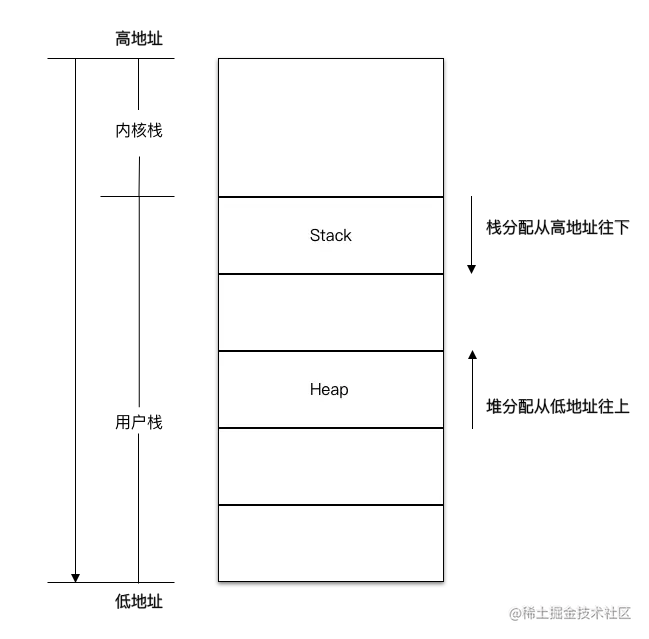 - 内核栈在高地址,用户栈在低地址。如果是 32 位操作系统,那么最经典的就是,用户栈区域为 [0, 3G],内核栈区域位 [3G, 4G];