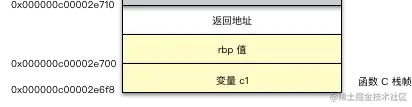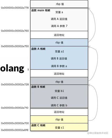 这个地方的栈帧区域标注都是以 rsp,rpb 寄存器界定的,所以每个栈帧中间有 16 个字节的间隔,分别是函数压栈的地址,还有 rbp 的保存值。