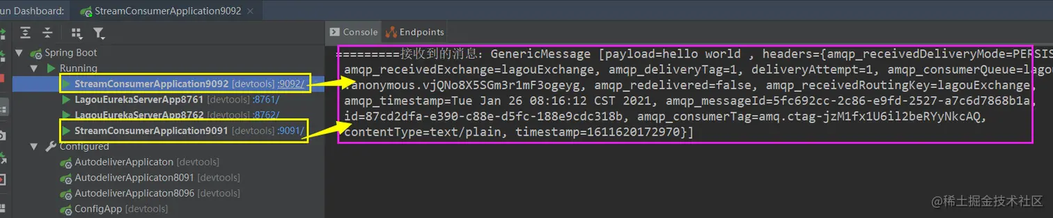 (1)首先启动消费者监听的服务 lagou-cloud-stream-consumer-9091