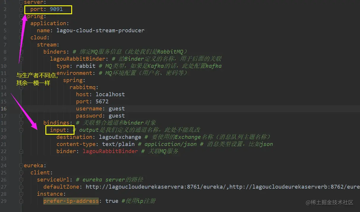 - lagou-cloud-stream-consumer-9091,作为消费者端接收消息