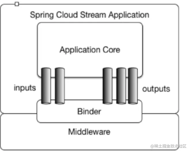 Spring Cloud Stream 是⼀个构建消息驱动微服务的框架。应⽤程序通过inputs(相当于消息消费者consumer)或者outputs(相当于消息⽣产者producer)来与Spring Cloud Stream中的binder对象交互,⽽Binder对象是⽤来屏蔽底层MQ细节的,它负责与具体的消息中间件交互。