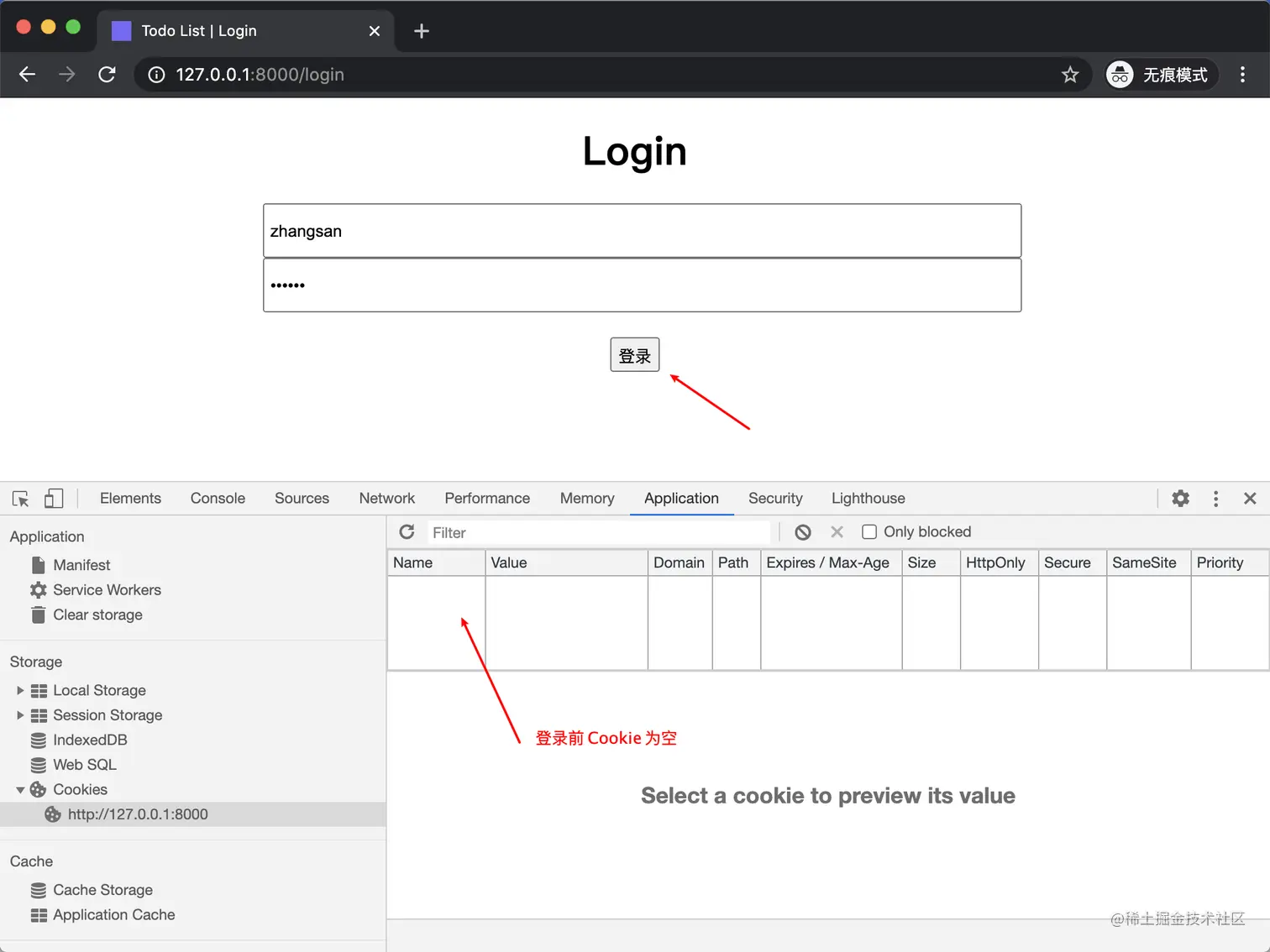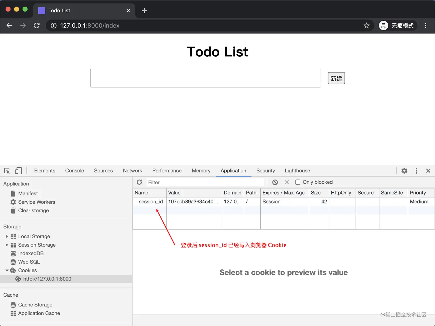 虽然使用 Cookie 能够实现用户登录,但是这种直接将用户信息 username=zhangsan 存储到 Cookie 的方式并不可靠。因为用户名很容易暴露,也很容易被猜到。假如网站的攻击者知道了我们系统中有 zhangsan 这个用户存在,那么他并不需要知道 zhangsan 这个用户的密码,只需要在浏览器中将 username=zhangsan 这个 Cookie 添加到 127.0.0.1:8000 域名下(在 Chorme 开发者工具中可以手动更改 Cookie),浏览器在下次请求 127.0.0.1:8000 服务器时就会自动携带这个 Cookie,服务器收到请求后就会认为请求是 zhangsan 这个用户发送过来的,这样网站攻击者就骗过了服务器的登录机制。故此,为了解决这个问题,又有人提出了一个叫作 Session 的概念。