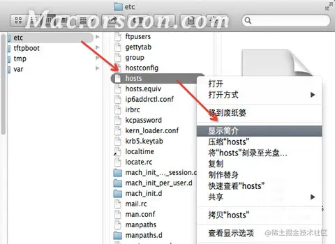 **5.**在etc当中打开【hosts】文件,选择【显示简介】,一样将文件的权限修改为【读与写】;