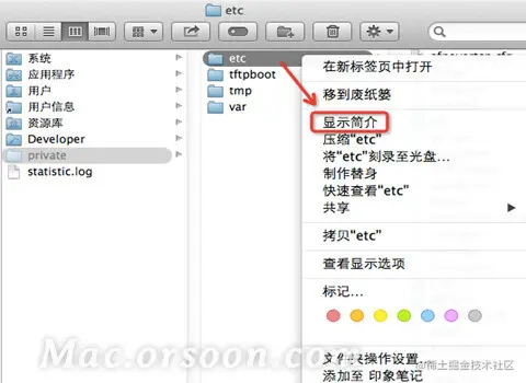 **2.**打开finder之后,按下键盘快捷键【shift+cmd+G】,输入【/private】,打开新页面。在private页面中右键点击【etc】,选择【显示简介】;