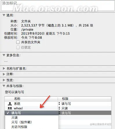 **4.**在【共享与权限】当中将权限改为【读与写】;