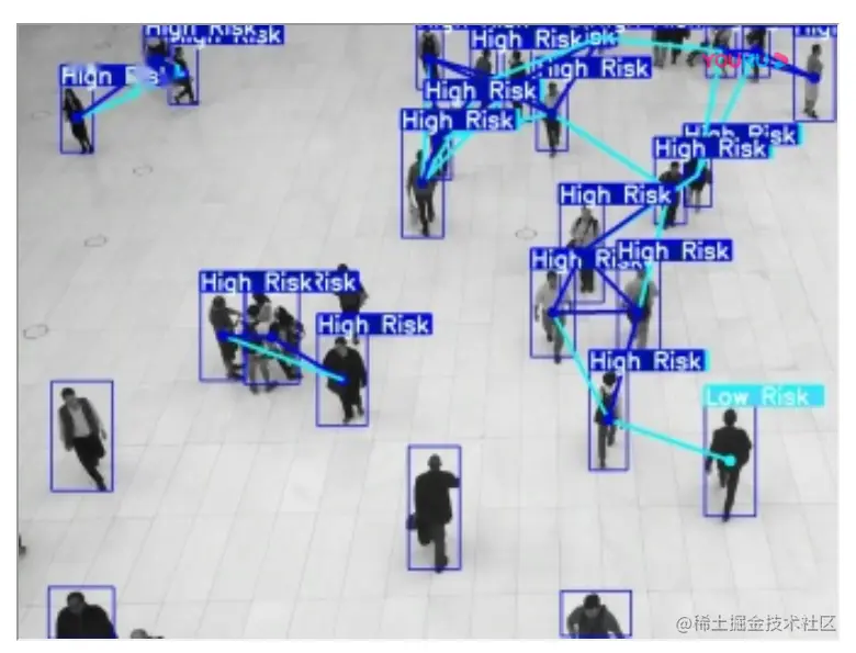 这是在华为HiLens Kit上部署推理保存的视频,通过计算行人间社交距离给出“High Risk” 或“Low Risk”的提示,下面来具体介绍一下。