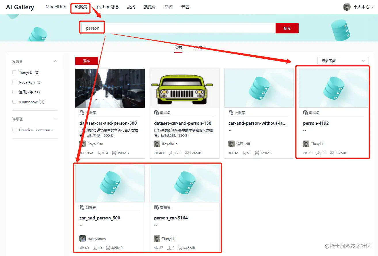 本Demo选择的是第一个——YOLOv3_Resnet18 GPU版本 TensorFlow,因为本Demo只需要对行人进行检测,所以选择了模型结构简单,训练和推理速度快的YOLOv3_Resnet18,节省训练时间,也就是节省训练成本呀。在训练方面,使用了来自开源行人数据集整理的数据集,因为只有person这一个标签,相比于COCO数据集80个标签,训练和部署推理更加具有优势,这里奉上 AI Gallery的数据集链接,没想到吧, AI Gallery不仅有算法,还有数据集,满足你的一切需要,有没有哆啦A梦的口袋的感觉(我承认我有一点夸张)