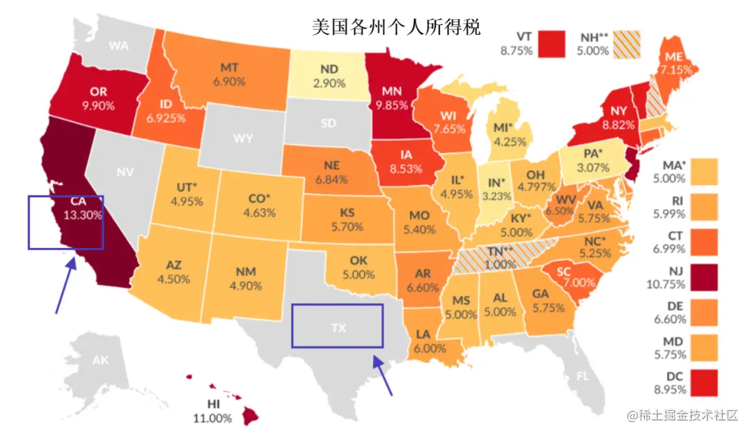 尤其在州个人所得税方面,加州13.3%的税高的吓人(甚至还有CEO税),德州则不用交税...