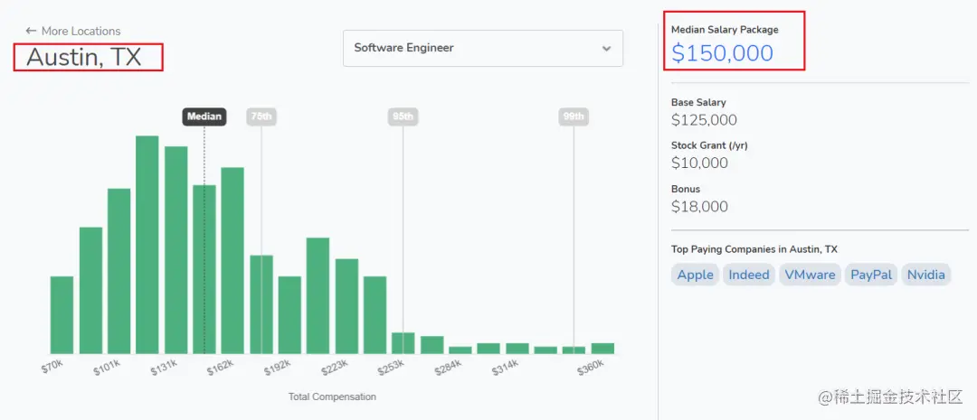 薪资方面,奥斯汀地区工程师的薪资中位数为240K,但免税后实际上到手的钱也没有差很多,生活在成本较低的奥斯汀,幸福感反倒会更高一些。