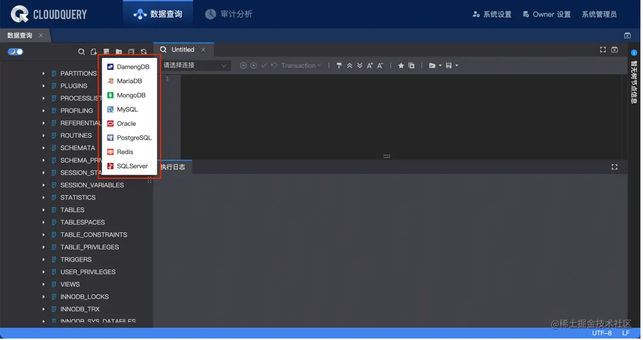 直入主题,给大家推荐一个适合小团队使用的数据库管理工具,CloudQuery。不知道大家有没有用过阿里云DMS,它是阿里数据库服务平台的云版本,提供免安装、免运维、即开即用、多种数据库类型与多种环境容易的web数据库管理终端,好用,但是要钱,企业版一年算下来也要将近5000块,而CloudQuery可以说是它的免费替代品。