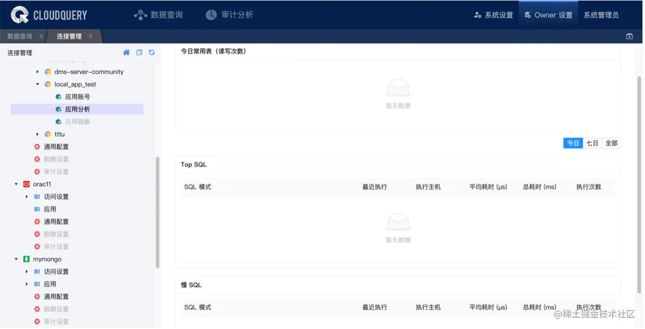 应用分析主要有三块,可视化展示「今日常用图」;TOP SQL、慢SQL排行,可查看应用中SQL执行次数排行,对平均耗时比较长的SQL进行筛选,排查相关有问题的SQL。