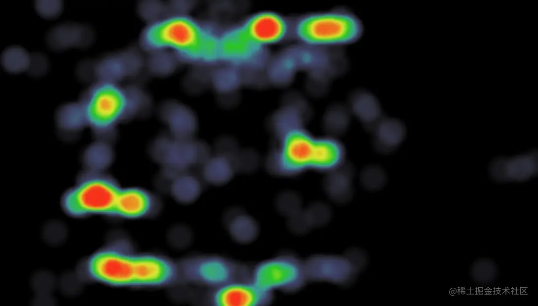 此热图的高对比度配色方案使红色区域看起来似乎比黑暗区域代表的值幅度要大得多,可视化的热力图用颜色描绘值的大小。较高的值显示为橙色和红色,而较低的值显示为蓝色和绿色。值之间的差异可能很小,但是颜色对比度会产生热感和增强的活动感。
