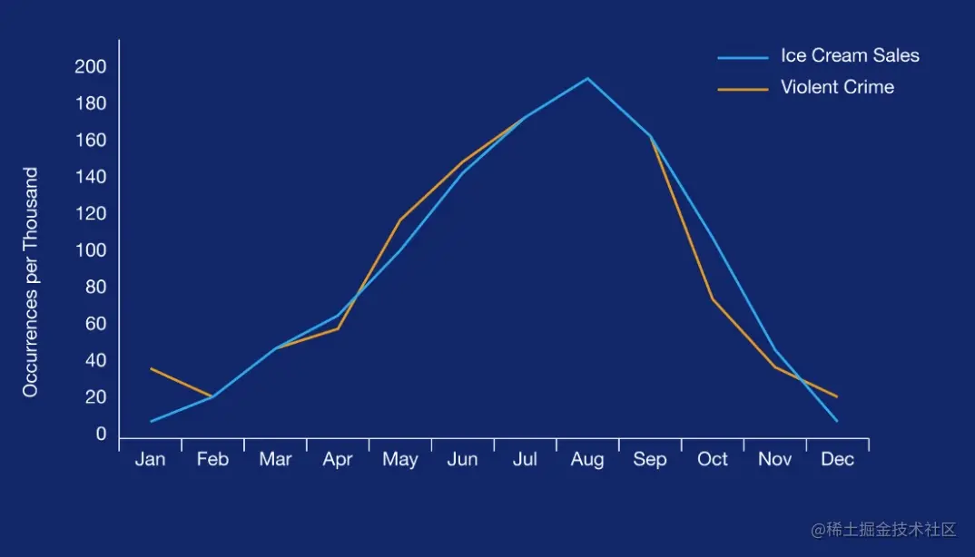 **也可能以错误地暗示因果关系的方式可视化相关性。**一个著名的例子是,由于天气温暖,冰淇淋销售量的增加与暴力犯罪的激增有关.