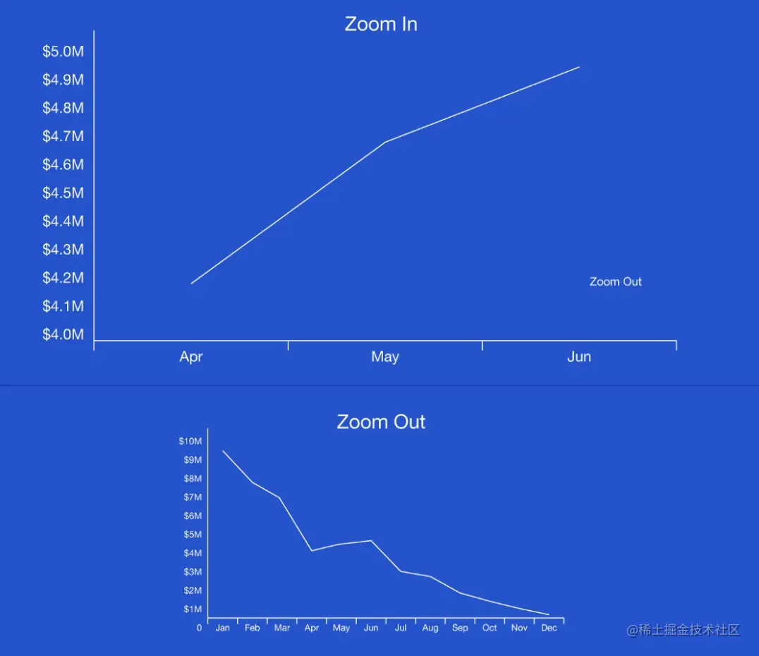 数据和时间是密不可分的。**可以放大时间范围,并显示有利于更广泛的叙述的数据。**可视化财务绩效是常见的罪魁祸首。考虑一个图表,该图表在短时期内显示出强劲的数字,使企业似乎在蓬勃发展。不幸的是,缩小显示该公司仅经历了小幅上升,并出现了急剧且持续的下跌。