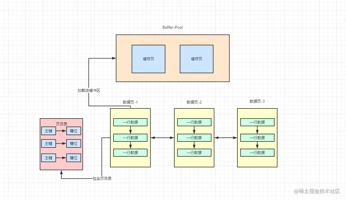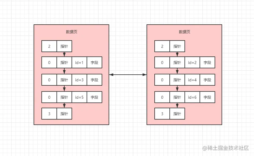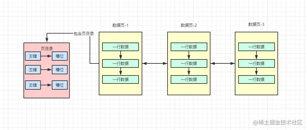 mysql存储在物理磁盘上时每个数据页是通过双向链表连接,数据页里的数据行通过单向链表连接,并将安装数据行id从小到大排列。而数据页中有一个页目录中存储了主键id->具体数据行槽位的的对应关系。如下图: