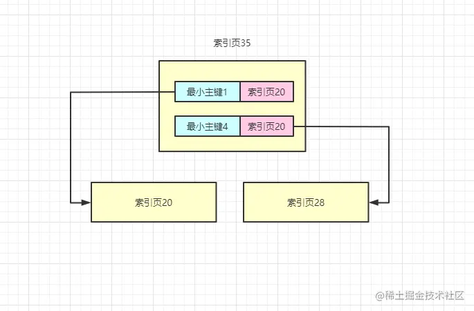 那么现在又有了一个问题现在又很多很多的所以页,你怎么知道你应该从哪个索引页找到合适的数据?这个时候就需要在索引页的上一层保存最小主键id和索引页的对应关系。如下图