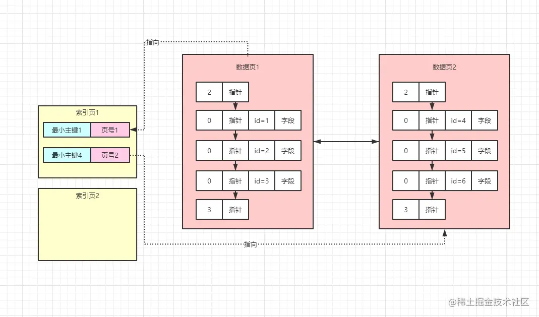 我们有看这个主键目录就可以查询id=2时,就直接去页号为1的数据页中,然后再根据页目录二分查找后轻松搜索到数据。那现在想一下如果数据很多很多我们不可能用一个主键目录来解决问题。这个时候就需要很多个主键目录这样就有了索引页。如下图: