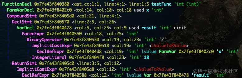 `-FunctionDecl 0x7fe43f840380 <ast.cc:1:1, line:4:1> line:1:5 testFunc 'int (int)'