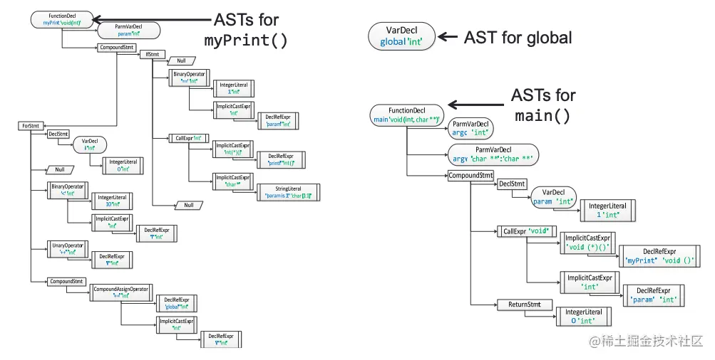 Clang 的 AST 与其他的编译器生成的 AST 的不同之处在于,它于 C++ 代码和标准非常相似。 比如括号表达式,编译时常量。