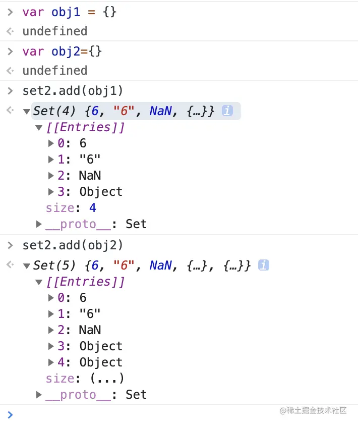 上面代码表示,由于两个空对象不相等,所以它们被视为两个值。