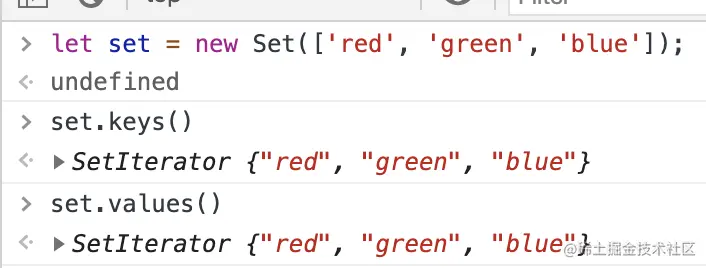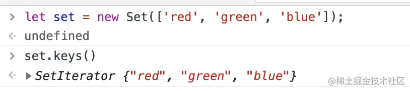 keys方法、values方法、entries方法返回的都是遍历器对象(详见《Iterator 对象》一章)。由于 Set 结构没有键名,只有键值(或者说键名和键值是同一个值),所以keys方法和values方法的行为完全一致。