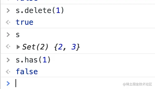 Set.prototype.delete(value):删除某个值,返回一个布尔值,表示删除是否成功。