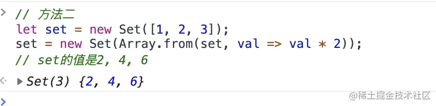 上面代码提供了两种方法,直接在遍历操作中改变原来的 Set 结构。