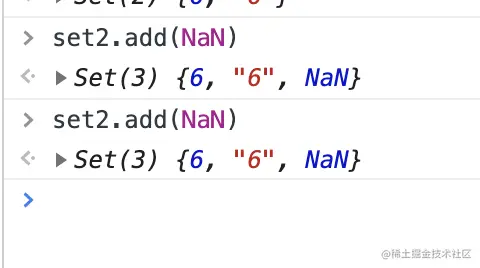 8、主要的区别是向 Set 加入值时认为NaN等于自身,而精确相等运算符认为NaN不等于自身。 如下所示,向set里面添加了两次NaN,但是只是生效了一次