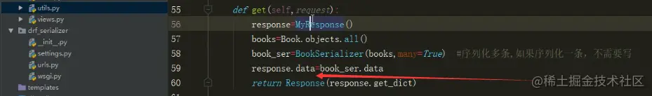 book_ser=BookSerializer(books,many=True) #序列化多条,如果序列化一条,不需要写