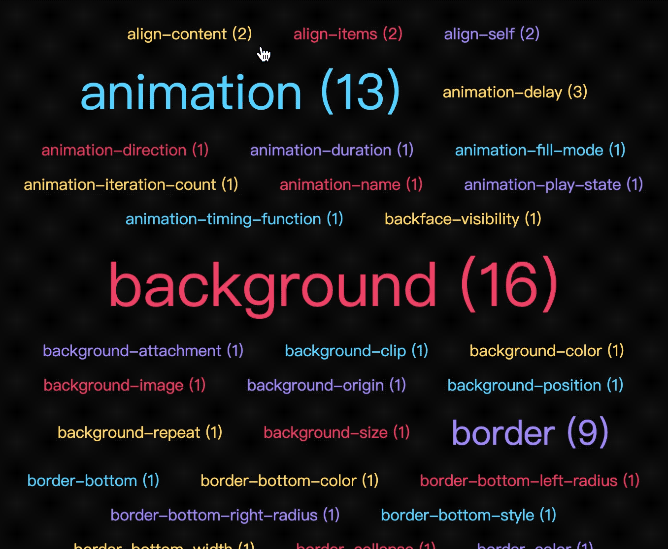 为了解决这个问题,我添加了一个简单的 if 语句,如果返回的 fontSize 小于1,则将fontSize设置为1。现在,所有标签的字体范围为1em至6em,四舍五入到小数点后两位。要增加最大标签的大小,只需更改 maxFontSizeForTag 的值即可。你可以根据你处理的内容数量来决定什么最适合你。