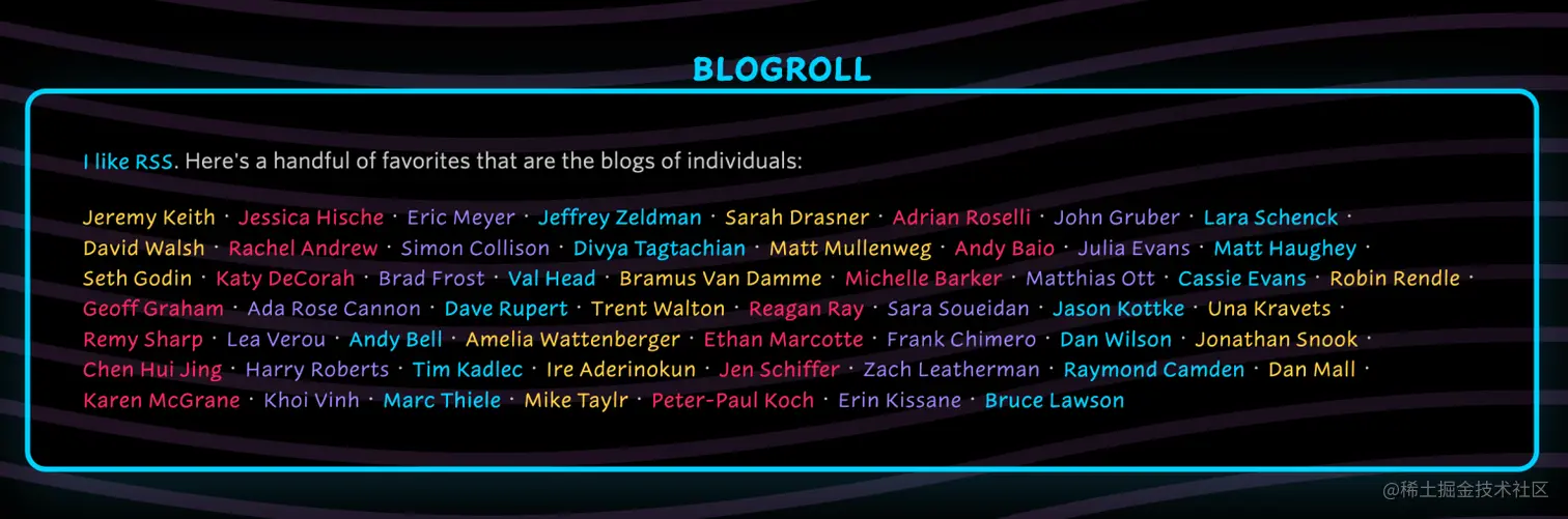 这个配色方案是直接从Chris’ blogroll偷来的,从标签1开始的每四个标签是黄色的,从标签2开始的每四个标签是红色的,从标签3开始的每四个标签是紫色的。