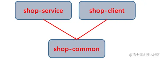 通过上面的代码我们不难发现,项目被分成了三个模块,分别是 shop-common、shop-service 和 shop-client,他们之间的依赖关系如下图所示: