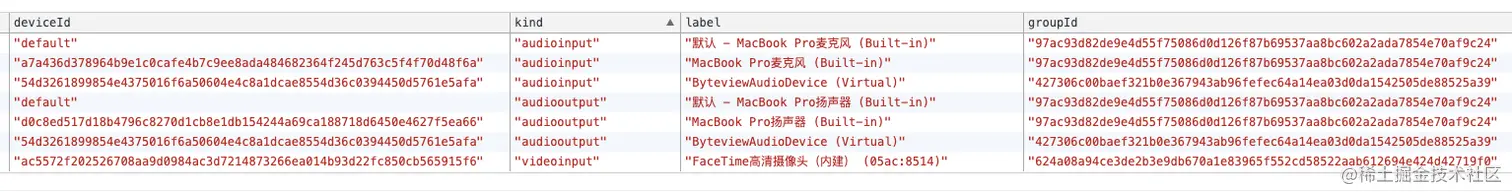 TIPS: 如果页面未获取浏览器设备权限,则返回的deviceId和label都是空字符串。调用mediaDevices.getUserMedia会触发询问权限