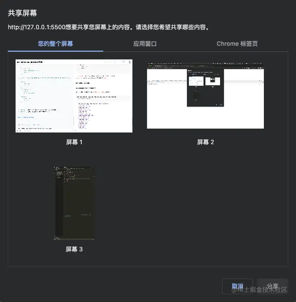 调用后会在所有屏幕/应用/Chrome标签页中选择一个共享画面