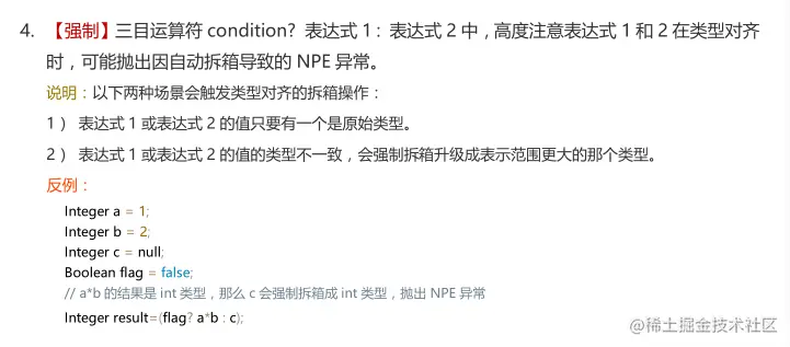 这个常见的坑的话就是由于自动拆箱导致的 NPE 异常。这个阿里巴巴开发手册(需要这个手册可以找我V:rxh8515)说的很明白了。