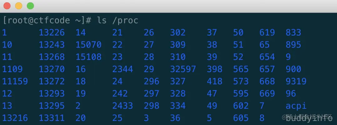 进程也不例外, Linux系统中有一个特殊的目录:/proc/,这个目录下的内容,不是硬盘上的文件系统,而是操作系统内核暴露出的内核中进程、线程相关的数据接口,也就是procfs,里面记录了系统上正在运行的进程和线程信息,来查看一下: