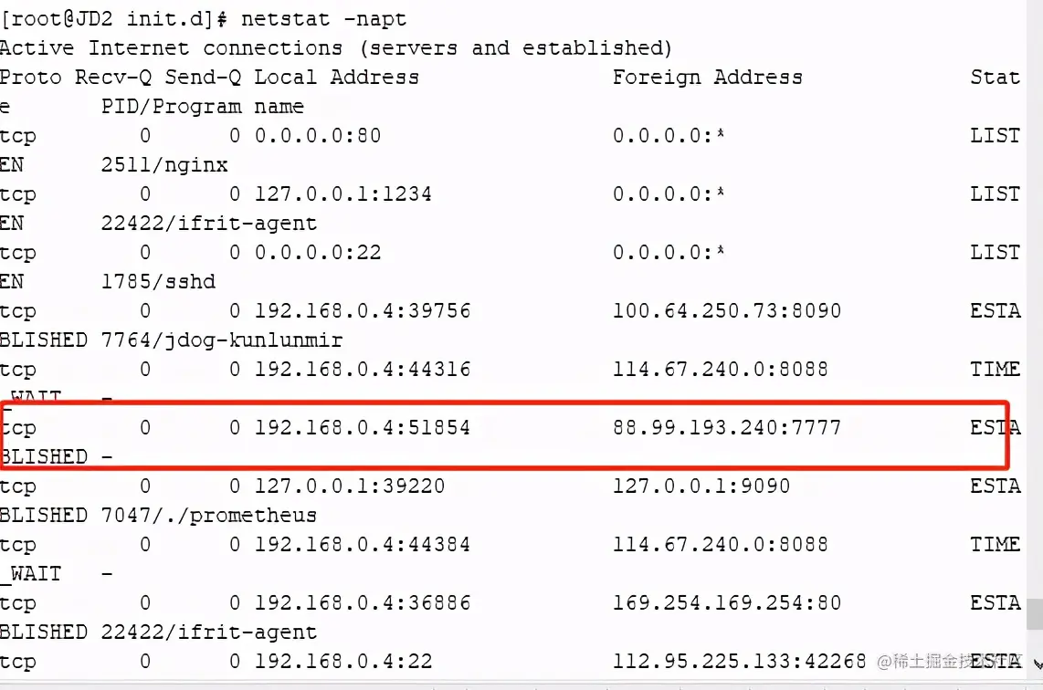 根据经验,我赶紧让他看一下当前服务器的网络连接,看看有没有可疑连接,果然发现了有点东西: