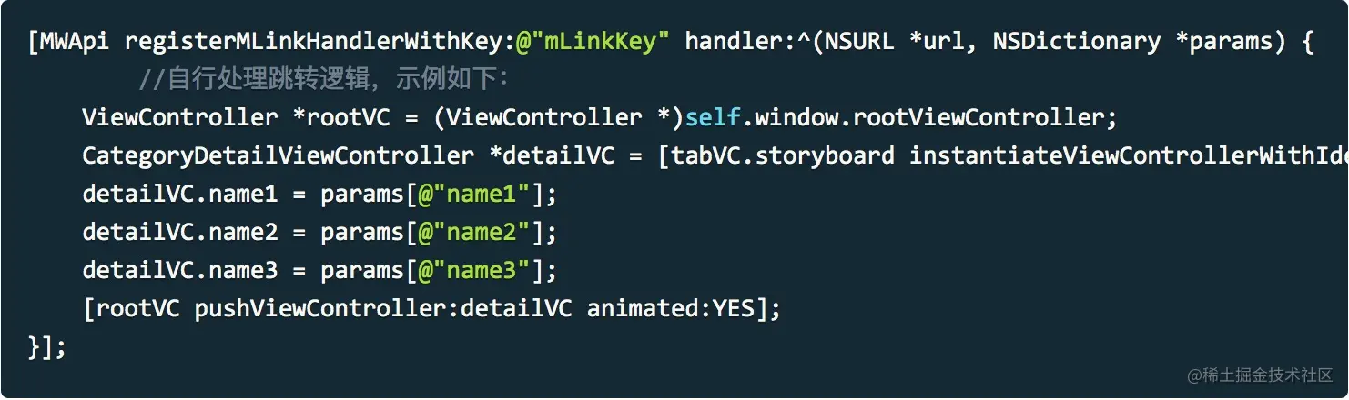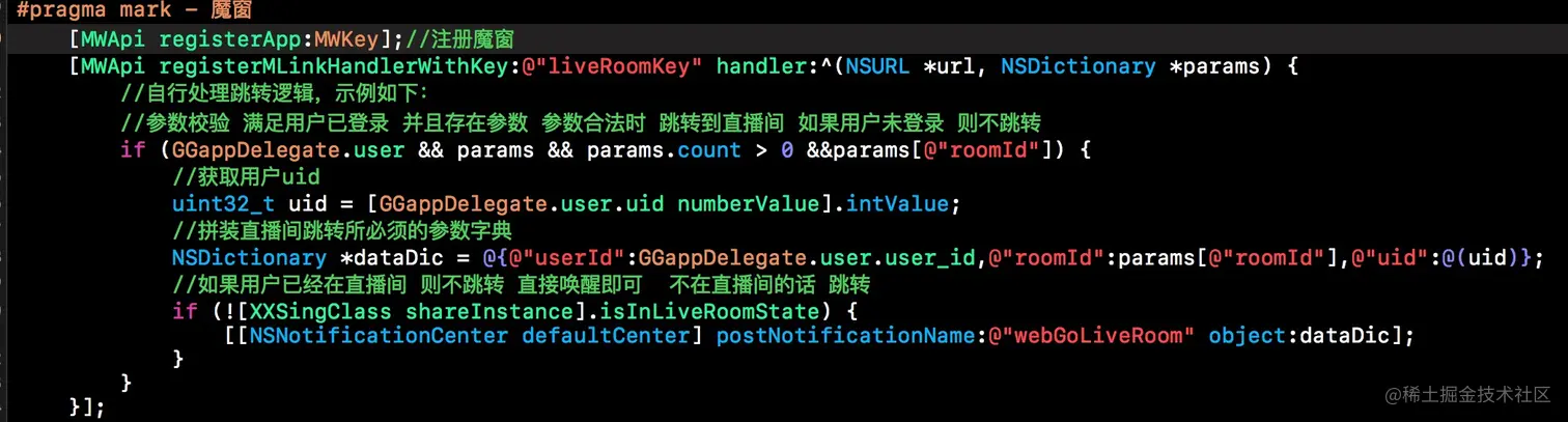 在 didFinishLaunchingWithOptions 这个 app 初始化方法里面, 其中 MWKey 就是魔窗 key, liveRoomKey 需要你替换成之前配置的魔窗 mLink key。回调代码里面,不同的项目有不同需求,灵活应变即可。