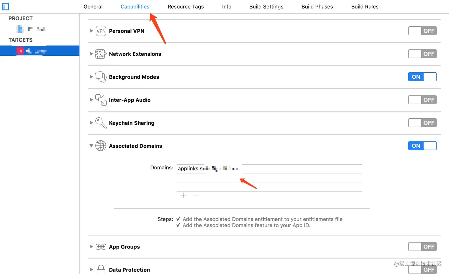 ②applinks 配置 这里的 Domains 一定要填你之前在魔窗配置后获得的那个魔窗域名,这里要保证不能出差错,否则无法完成跳转