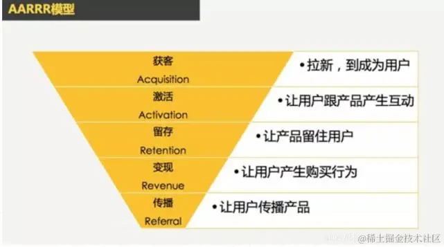AARRR模型用来分析用户行为,为产品运营制定决策,实现用户增长。对应产品运营的5个重要环节: