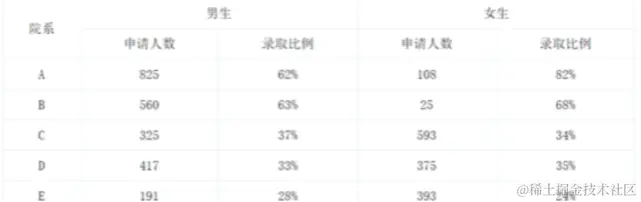 比较著名的当属1973年加利福尼亚大学伯克利分校性别歧视的例子,男生录取率为44%,女生录取率为35%,根据这个数据有人就觉得该校有性别歧视的倾向,但如果每个院系分开来看录取率的话,可以发现,A B D 三个院女生的录取率都高于男生。这个悖论告诉我们一个简单的统计数字不能完全描述其背后的复杂意义,因此只看到数据整体,而忽视数据内各个部分的差异是不对的。