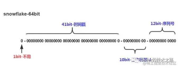 由上图可以看出,雪花算法是由4个部分组合而成的:符号位+41位时间戳+10位机器码+12位序列号。