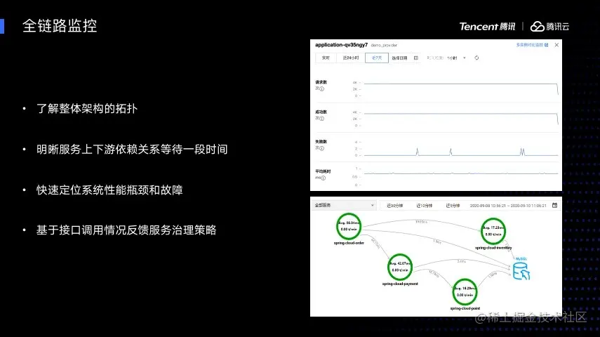 可以想象一下,我们肯定不允许以一种黑盒的状态进行迁移。所以同时引入了全链路监控、全链路跟踪的功能,可以了解到整体架构的拓扑,还可以明晰服务上下游依赖关系,快速定位系统性能瓶颈和故障,也可以基于接口调用情况反馈服务治理的策略。