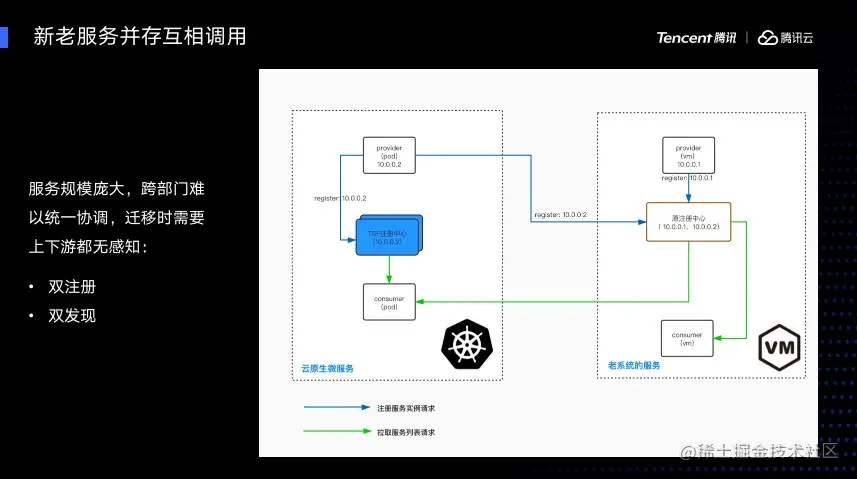 如果不更新新老服务互调和并存的能力会出现一个问题,我们设想一下如果有一个服务A依赖B,A和B都是老服务,这时B想迁移,发版到新的注册中心上面,等B全量迁移完之后,A那边就没有可用的B的节点,这时A就会爆错,这种情况是在迁移时不能忍受的。