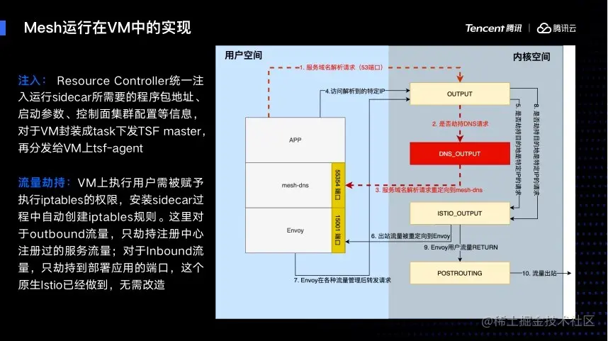 第二是流量劫持,VM上执行用户需被赋予执行Iptables的权限,安装Sidecar过程中自动创建iptables规则,对于outbound流量只劫持注册中心注册过的服务流量,还需要劫持DNS 53端口的流量,我们先把DNS请求引到mesh-dns,如图中红色部分。对于inbound流量,只劫持到部署应用的端口,而原生Istio已经做到所以无需改造。