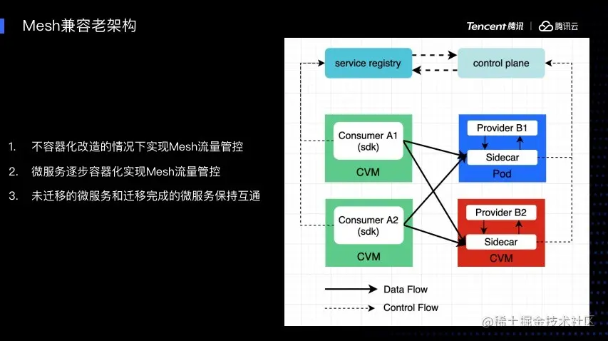 我们知道Service Mesh的优点是可以让老代码在不改一行代码、一行配置的情况下,能够接入统一的治理和统一观测能力。但是有些老服务不想先容器化,或者容器化有一定的困难,这种情况下它需要实现一个统一的Mesh流量管理和服务治理功能。同时,新的一些试点应用可以逐渐进行容器化,并且进行Mesh流量管控。同时还要达到没有迁移的微服务和已经迁移完成的微服务能够保持互相的互通的目的。可以看到这里讲的第二点,微服务逐步容器化实现Mesh流量管控。