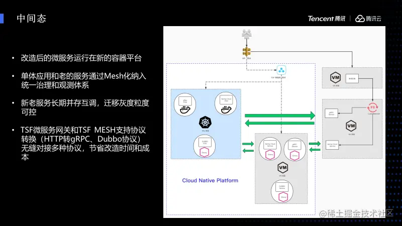 接下来讲一下长期可能存在的中间态,中间态首先是改造后的容器化微服务,它直接运行在容器平台。一些单体应用可能不想容器化,或者它的老服务不想容器化,这个时候可以通过VM的Mesh来纳入到统一治理和观测的体系,同样能够享受到云原生的能力,新老服务可以长期互调,可以让我们的迁移更加的可控。同时我们的TSFMesh除了支持标准的HTTP和gRPC协议,还支持Dubbo协议,实现让老的Dubbo协议无缝接入。