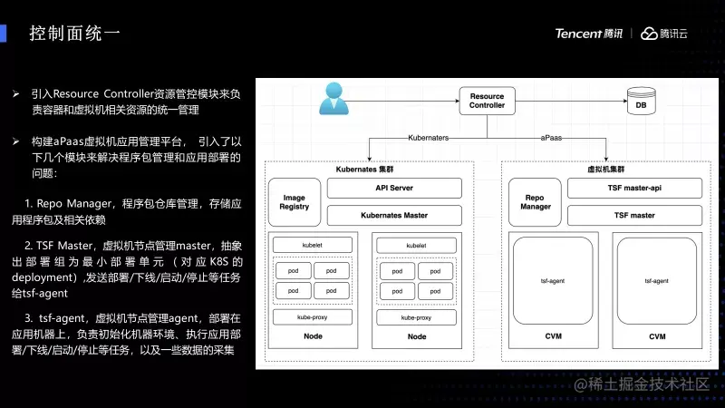 一个是TSF master-API,主要是控制虚拟机节点的管理作用,并且抽象出一个最小的部署单元,管理虚拟机的生命周期。
