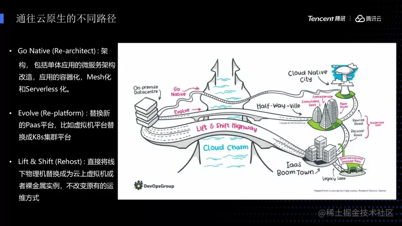 下图中展示的是Gartner咨询公司抽象总结出来的三种云原生架构的迁移路径。